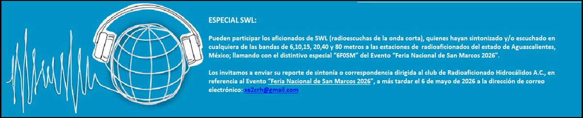 DISTINTIVO: 6F0SMEVENTO: De Radioaficionados Feria nacional de San Marcos 2026LUGAR: republica MexicanaPERIODO: del 1 al 30 de abril de 2026PARTICIPANTES:Todos los radioaficionados con licencia o concesión vigente en su respectivo país PERIODO:De las 00:00 UTC del día 1 de abril hasta Las 23:59 UTC del día 30 de abril de 2026 BANDAS Y MODOS:6,10,15,20,40 y 80 metros SSB, CW, RTTY y FT8, FT4 LLAMADO E INTERCAMBIO:¨ Llamarán estaciones de miembros del radio club y/o estaciones de Aguascalientes en SSB ; “CQ San Marcos 6F0SM” o “CQ Feria 6F0SM” ¨ Llamaran en CW y RTTY; “CQ SM 6F0SM” y en FT8, FT4 “CQ 6F0SM <mas # de GRID>” · El intercambio en SSB, CW y RTTY será reporte de señal y NOMBRE, · En el caso de FT8, FT4 el intercambio en dB. LOG/BITACORA:Los participantes (nacionales o extranjeros) deben enviar su bitácora de sus QSO vía formulario anexando archivo en formato ADIF, a la dirección de correo: xe2crh@gmail.com ; La fecha máxima de envío de sus comunicados es el 6 de mayo de 2026 CONFIRMACIÓN Y DIPLOMA:* Los QSO serán únicamente confirmados en formato electrónico: LoTW, QRZ, Club Log y eQSL. * Se otorgará diploma electrónico conmemorativo al contactar a todos los miembros del radio club y a estaciones hidrocálidas registradas participantes. QSL MÁNAGER del evento: Ben Ubach (XE2AU) e-mail: xe2au01@gmail.com SITUACIONES ESPECIALES: Estas serán tratadas en el seno del radio club, y sus resoluciones serán finales e inapelables |